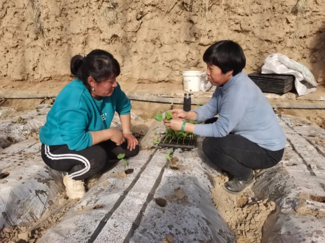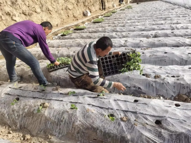 辛海軍的另外一棟溫室里,幾個(gè)村民正在定植香瓜幼苗。村民們用鑷子將幼苗放進(jìn)提前挖好的塑料薄膜下的小坑中,再向四周撒上沙土、澆上水,一株幼苗就栽好了。