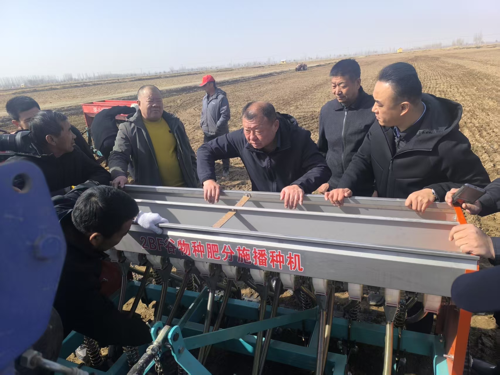 迎著正午陽光,隨著一聲號令,幾臺播種機沿著田壟勻速行駛,一粒粒飽滿的種子被精準地播撒,種下新一年的希望。農(nóng)戶們圍在機械旁,仔細聆聽技術(shù)人員講解操作要點與注意事項,現(xiàn)場交流熱烈。